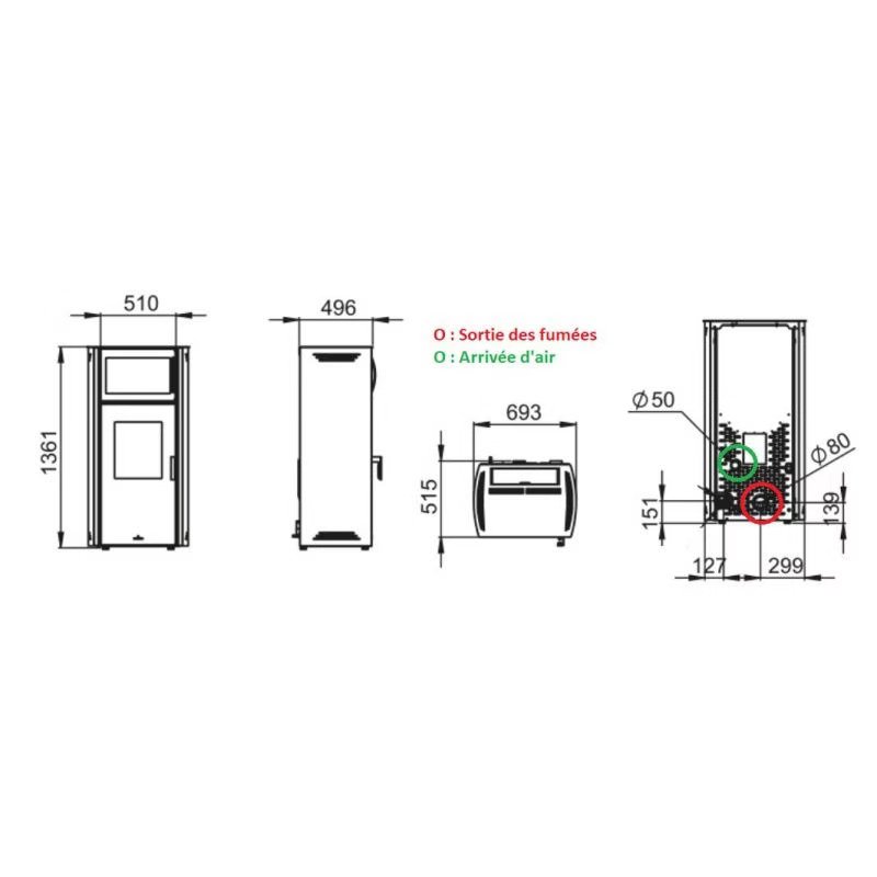 Tuyau de sortie de fumée: diamètre 80 mm.